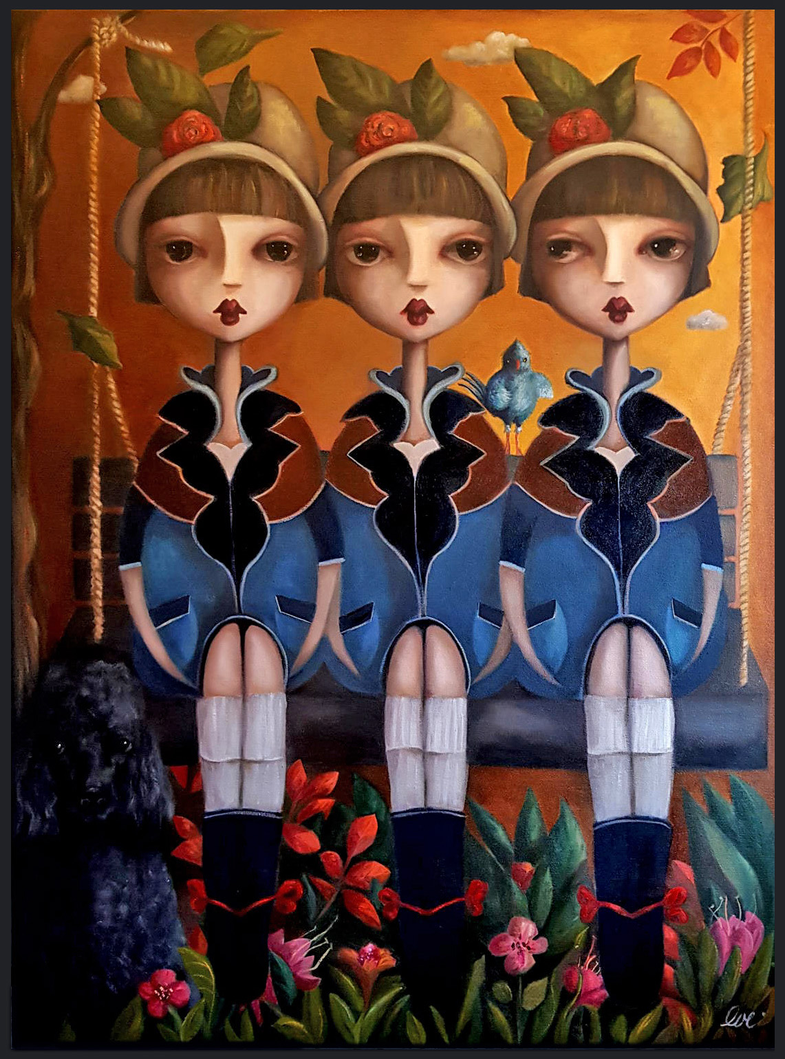 'On their inaugural autumnal stroll, these three serene beauties bask in wonderment, captivated by the splendor of the transformative season - autumn's kaleidoscope of colors, the gentle cascade of fallen leaves whispering promises of nature's perpetual renewal.'