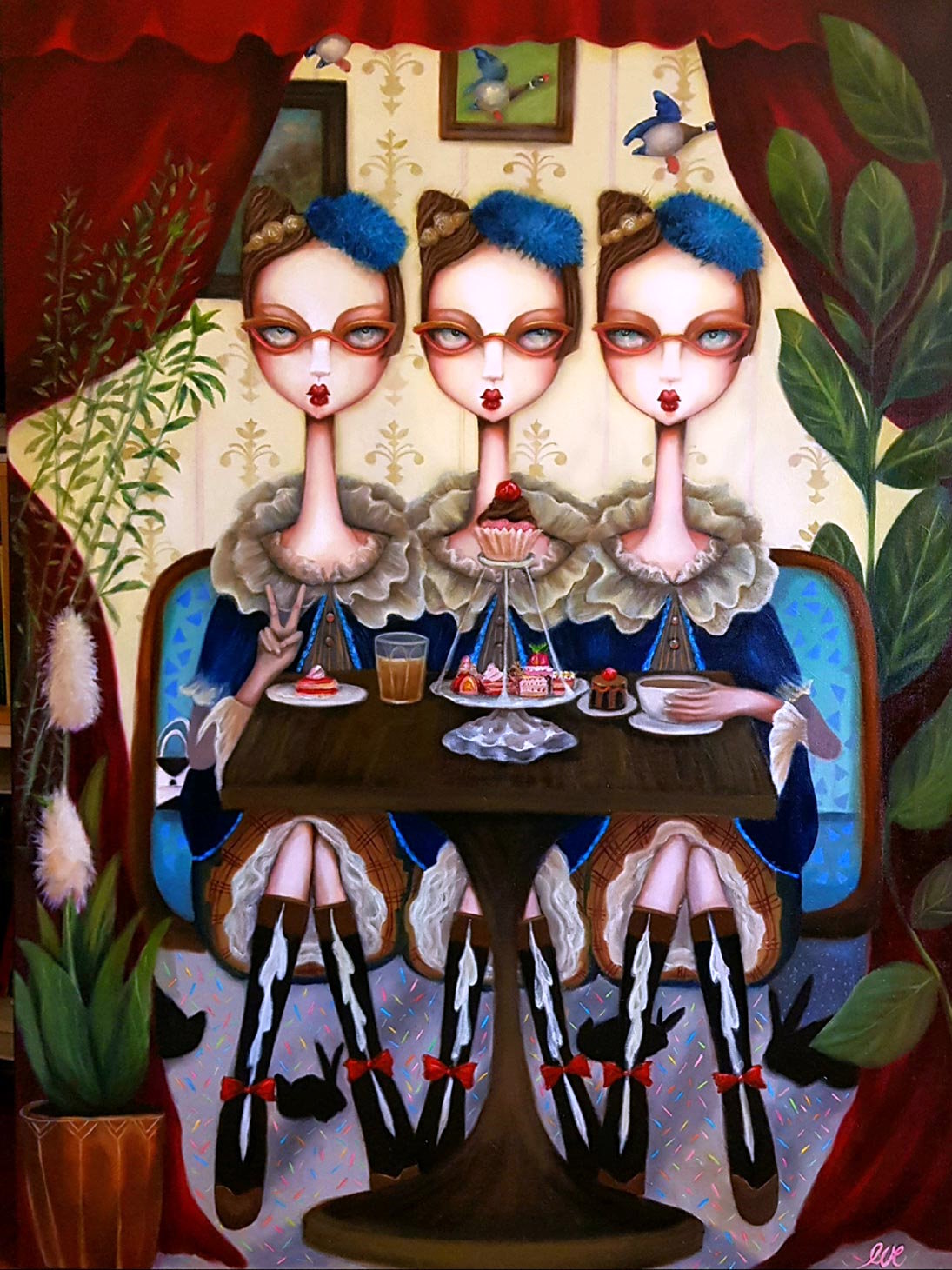'In their private, lush sanctuary, these three figures represent the multifaceted nature of a single being, savoring life's sweet indulgences with quiet joy. United in solitude, they find fulfillment and completeness within themselves. This painting celebrates femininity and the power of self-companionship. The black bunnies, symbols of humility and mystery, represent a continuous process of renewal.'