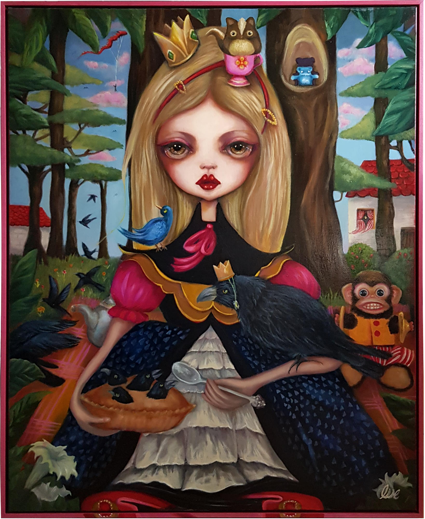 'A queen of beauty, power, and pride, her banquet held a dark surprise. Four captive birds, their plumage midnight hue, were trapped within her pie. Descendants of the raven king, perhaps?