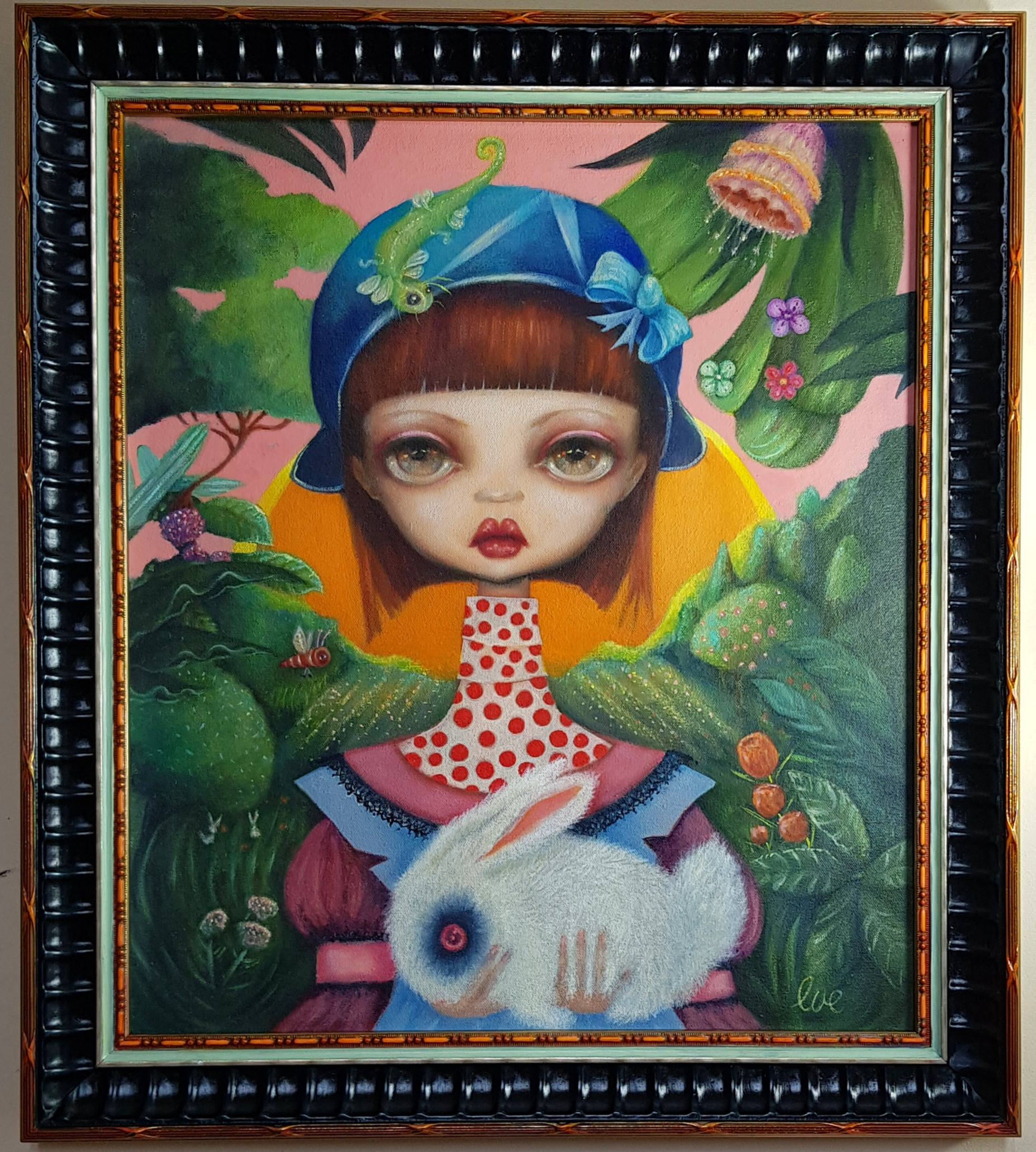 A child of grace, a bunny's friend,In realms unseen, where colors blend.A surreal scene, a dreamlike sight,Pure innocence, bathed in light.