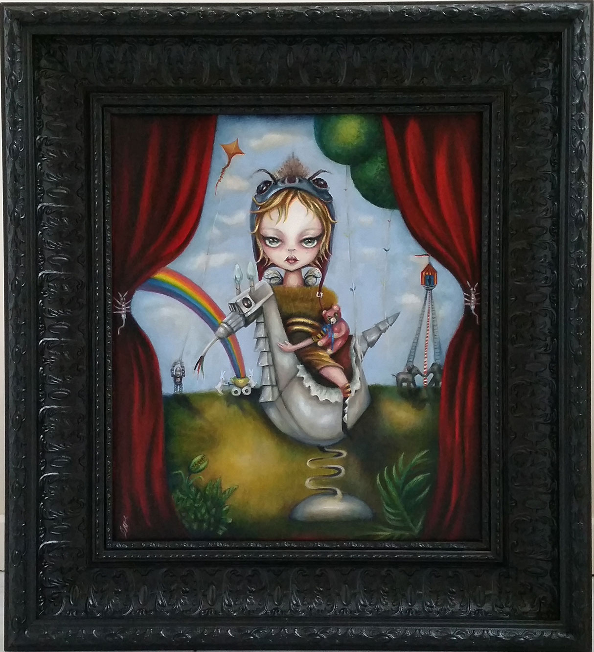 “The curtains open to a bee child, astride a steed of steel, dreams of rainbows arching over the scene. A robot, a kite dancing in the breeze, while elephants